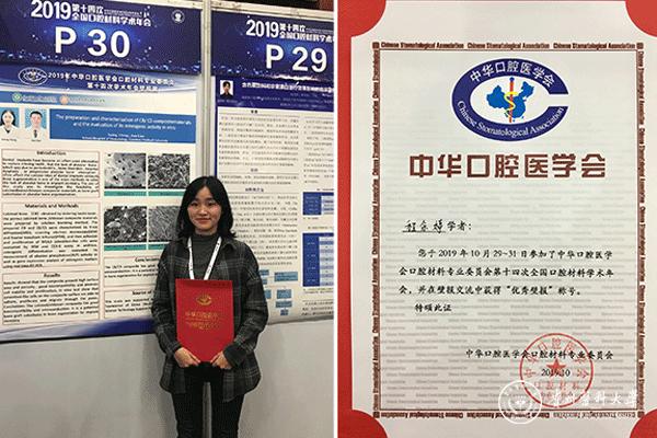 会议期间举办的口腔材料壁报交流,是经过组委会前期的严格初筛和专家现场严格评选的,最终评选出20名优秀壁报,万象城官网口腔医学院2017级研究生程余婷的壁报“The preparation and characterization of CB/ CS composite materials and the evaluation of its osteogenic activity in vitro”成功入选。程余婷的壁报主要讲述通过体外理化性能,细胞生物学性能等实验评估煅烧骨/壳聚糖复合材料作为牙槽骨骨增量的可行性,为牙种植中的骨增量提供一种新的选择。经过激烈角逐,在最终屏蔽中获“优秀壁报”奖。
