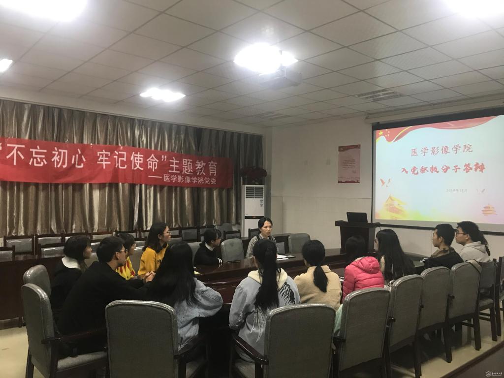 为全面考核入党积极分子情况,加强发展党员工作质量控制。近日,医学影像学院在南北校区召开入党积极分子答辩会。医学影像学院党委副书记姚琨、学生党员以及二十名入党积极分子参加答辩会。学生党支部书记陈丽主持会议。