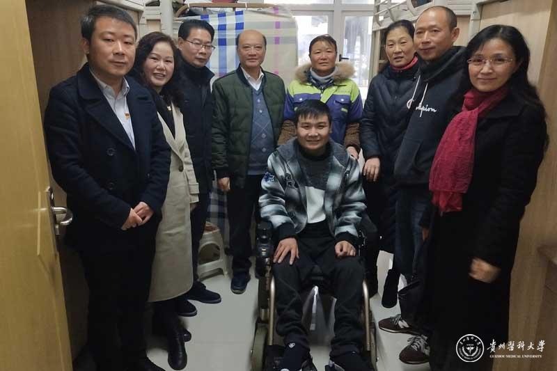 11月20日,离退休工作处副处长刘梅华、副处长周辉、关工委副主任马孝军在医学人文学院领导班子及医学人文学院学生科全体成员的陪同下,前往花溪校区5栋宿舍楼看望慰问我院残疾学生张兵兵,发放了慰问学习生活用品,送去了学校的关心和温暖。
