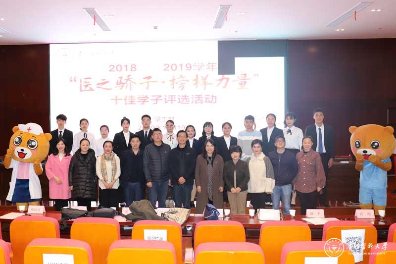 为展现万象城官网学子积极进取,榜样引领的先锋模范作用,11月19日,学工部在花溪区道德讲堂举办了第二届“医之骄子•榜样力量”十佳学子评选活动。特邀请贵州省就业指导中心副主任周明、贵州民族大学数据科学与信息工程学院党委书记王恋、贵州师范大学学工部副部长田伟、贵州师范大学求是学院党委副书记帅永平、贵州财经大学团委副书记贾秋玲、贵州商学院学工部副部长田歆担任评委。学工部全体人员、各学院分管书记、全体辅导员及学生代表观看比赛。