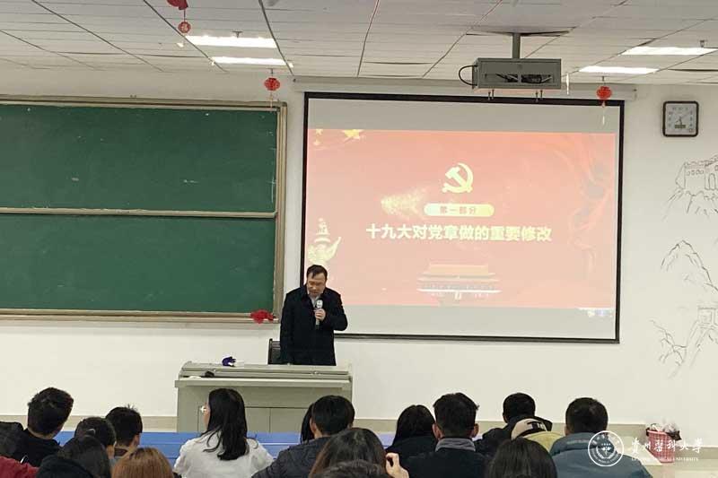 刘杰麟带领同学们一起深入学习贯彻党的十九大精神和习近平新时代中国特色社会主义思想,深刻学习领会党的建设的新要求,推动全面从严治党向纵深发展。他谈到作为一名党员,要自觉学习党章,执行党章,贯彻党章,维护党章,把学习党章与自身实际相结合,用实际行动践行党章的要求。