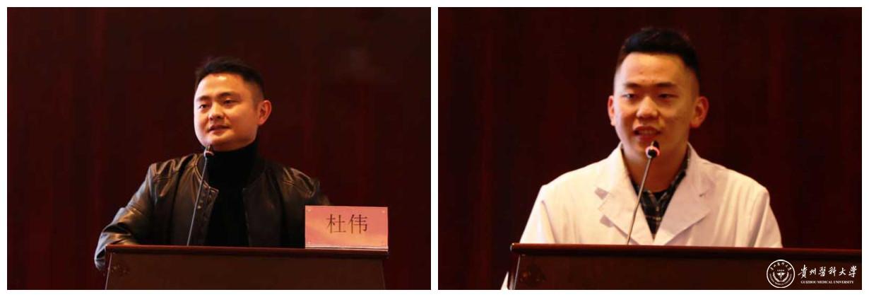 成立大会结束后,男护生协会的首秀活动——“不忘初心、牢记使命”走进“男”丁格尔校友事迹报告会拉开帷幕。本次报告会邀请到护理学院2009届优秀校友,贵州省人民医院急诊留观输液中心护士长杜伟和护理学2018级唐郅尧同学作为演讲嘉宾。杜伟分别从“我是谁?我从哪来?我要做什么?”三个方面讲述自己的学业、事业经历,向同学们展示了作为一位男护士在学习中的应该做到全面发展,提高专业归属感。以一个男护士在临床工作中运用自身独特的思维模式和对工作的热爱为维护健康、促进健康做出的努力,并因此成就自己,实现了自我价值。由此激励同学们热爱护理学、助产学专业,有位才能有位,有位才能沿着梦想之路前行。唐郅尧结合自身学习经历的做了经验交流发言。他表示我们要微笑着面对困难,坚持就是胜利。两位嘉宾的演讲引发了现场师生的共鸣。
