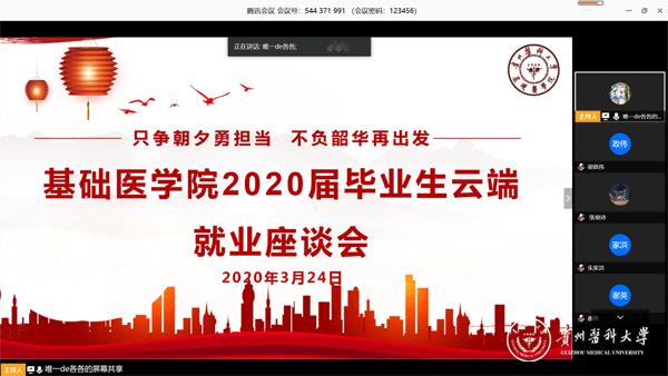 为贯彻落实省教育厅《关于做好疫情防控期间高校毕业生就业工作的通知》文件精神和学校就业工作相关部署,紧紧围绕学校2020年本科毕业生就业创业工作目标,解决学生现阶段在就业过程中所遇的困难和疑问,3月24日,基础医学院依托腾讯会议平台召开“只争朝夕勇担当·不负韶华再出发”基础医学院2020届毕业生云端就业座谈会。学院院长曾柱、党委副书记王妤煜、副院长康颖倩、副处级组织员邓欣、教学管理科王赟、董宇华,专业负责人吴宁、辅导员周儒、2016级医学实验技术全体同学参加,座谈会由学生管理科陈培各老师主持。