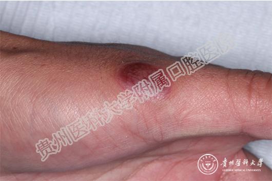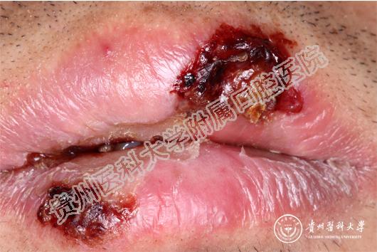 多见于嘴唇及颊部、舌头。开始时,口腔黏膜有烧灼感,明显充血发红、水肿,有时出现红斑、水疱,但疱很快破溃形成溃疡或糜烂。大面积的溃疡或糜烂会形成大量渗出物,形成假膜,疼痛非常明显,严重影响进食和说话。