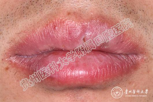 (患者治疗前后的上下唇病损对比 上图:治疗前,下图:治疗1周后)