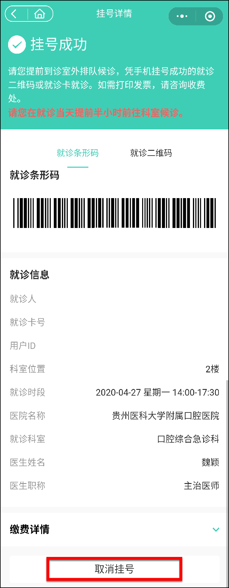 5、当班挂号及预约挂号均可在线上取消,但是过期号需到医院线下窗口办理退费。