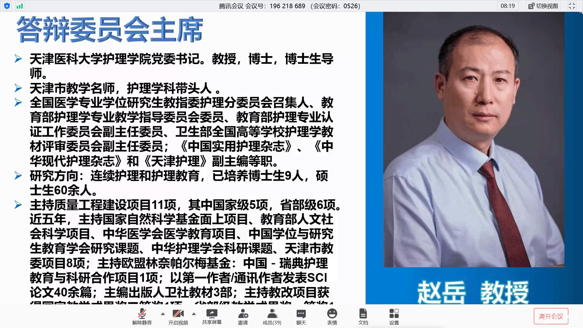 本次答辩有幸邀请到天津医科大学护理学院党委书记、博士生导师、全国医学专业学位研究生教指委护理分委员会召集人、教育部护理学专业教学指导委员会委员、教育部护理专业认证工作委员会副主任委员赵岳教授担任答辩主席,贵州中医药大学护理学院党委书记、国家自然科学基金评审专家石国凤教授、遵义医科大学护理学院院长江智霞教授、awc777万象城娱乐官网公共卫生学院王子云博士、awc777万象城娱乐官网基础医学院徐键炜博士担任答辩委员,护理学院王芸芸讲师担任答辩秘书。护理学院及附属医院导师、专业教师和全体研究生同学近50人旁听学习。