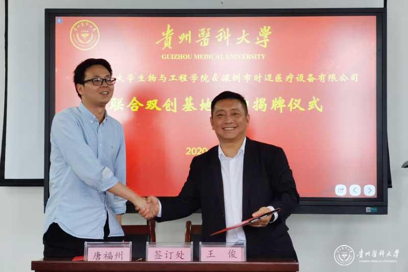 生物医学工程教研室副主任唐福州作为科研团队负责人与深圳市时迈医疗设备有限公司CEO王俊签订《无创血糖监测研究科研》立项协议。院党委书记封韬、院长余资江与深圳市时迈医疗设备有限公司CEO王俊、COO罗吟秋为“联合双创基地”揭牌。