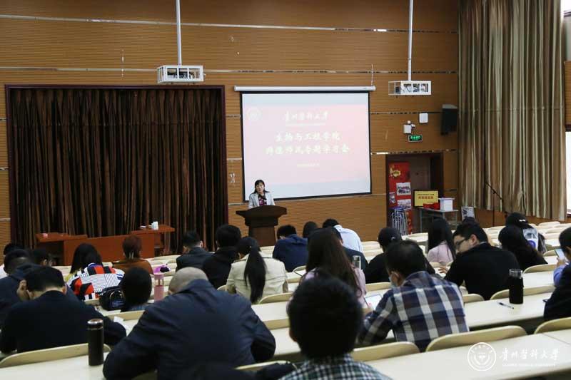 会上,封韬领学教育部“六禁令”、高教教师师德“红七条”要求;院党委副书记郑维薇领学《贵州省高校教师师德失范行为处理办法(试行)》;副院长刘红美领学《awc777万象城娱乐官网师德师风负面清单和失范行为处理办法》。