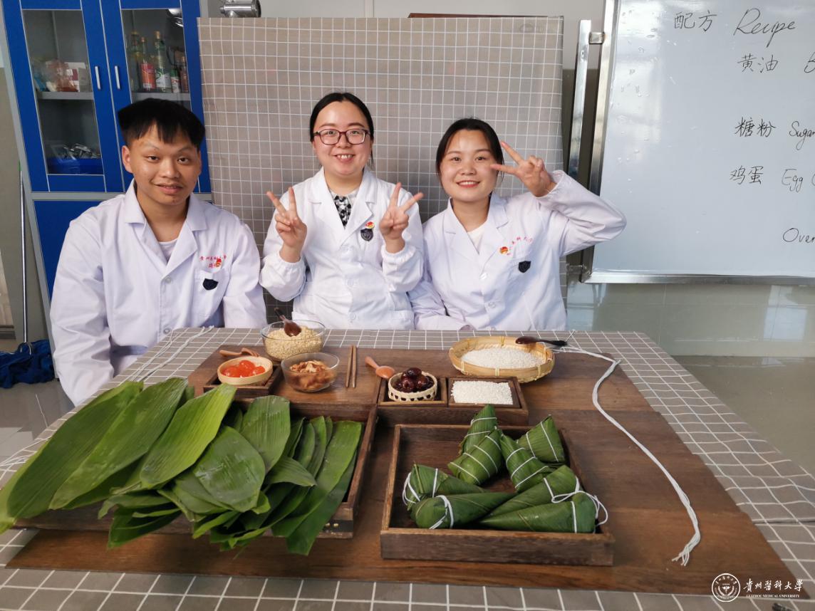 微视频的拍摄前期,宋小娟和原琦2位专业课教师带领同学们认真准备文案脚本,提前将糯米泡好,粽叶洗净,准备好五花肉、咸蛋黄、红枣等食材。拍摄制作过程中,老师为同学们讲解了粽子的起源、分类、不同馅料粽子的营养区别以及食用粽子的一些注意事项。在老师的带领下,大家动作娴熟,折粽叶、填料、绑线,一气呵成,现场的同学们在体验了粽子的制作过程中也学习了相关专业知识。