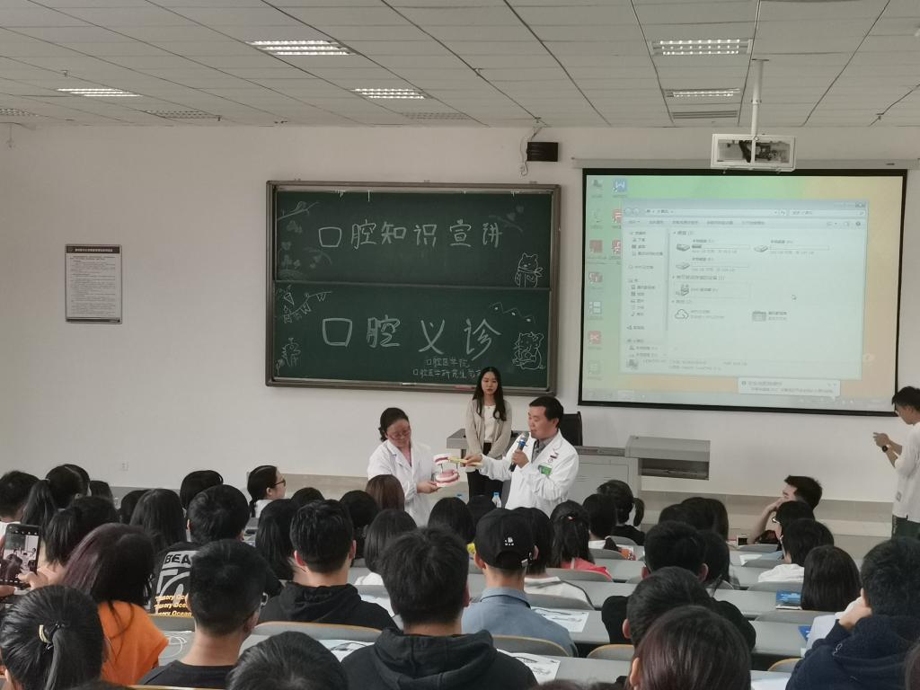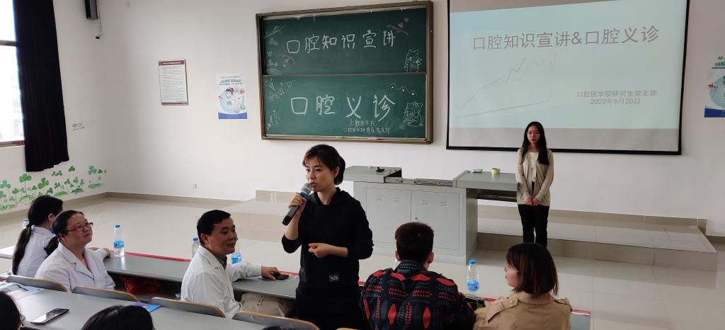 在大学城,口腔医学院党委副书记钱禾带领口院教职工及部分研究生在九思楼4406教室开展了2020级新生口腔义诊及宣讲活动,大家齐聚一堂,共同学习和讨论口腔知识。宣讲活动由研究生科研管理科负责人廖健主讲,其余老师及学生配合宣讲,讲座从认识牙齿到口腔常见疾病、从如何护理口腔到怎样正确刷牙、从判断自己是否患有口腔疾病到如何帮助身边人培养口腔保健意识,事无巨细一一解答。过程中,组织开展了针对2020级新生的口腔义诊,让同学们在了解自己口腔健康情况的同时,进一步了解选择的口腔专业是如何深入生活和体现价值的。