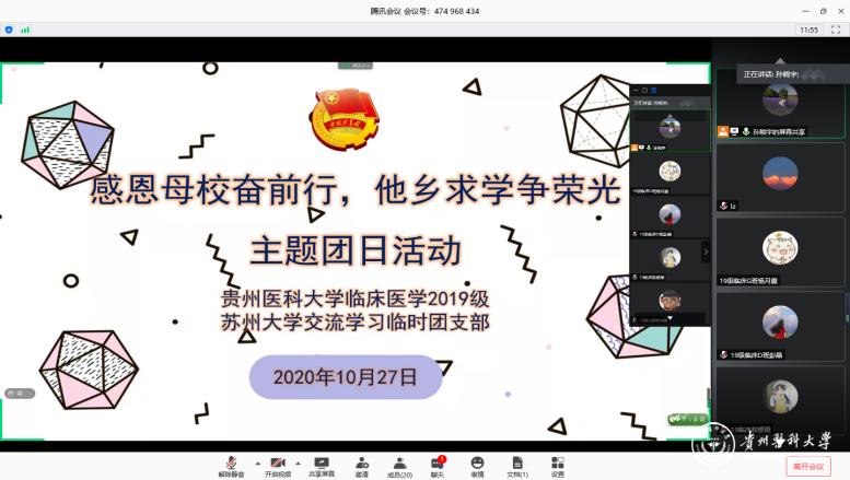 10月27日,基础医学院赴苏州大学交流学习临时团支部开展了“感恩母校奋前行,他乡求学争光荣”的主题团日活动。活动以线上腾讯会议的形式开展。教务处副处长汪志勇、校团委副书记桂晓玲、基础医学院党委副书记王妤煜,学院学生科、分团委负责人、辅导员及十五名赴苏州大学交换学生参加。活动由2019级团总支书记孙晓宇主持。