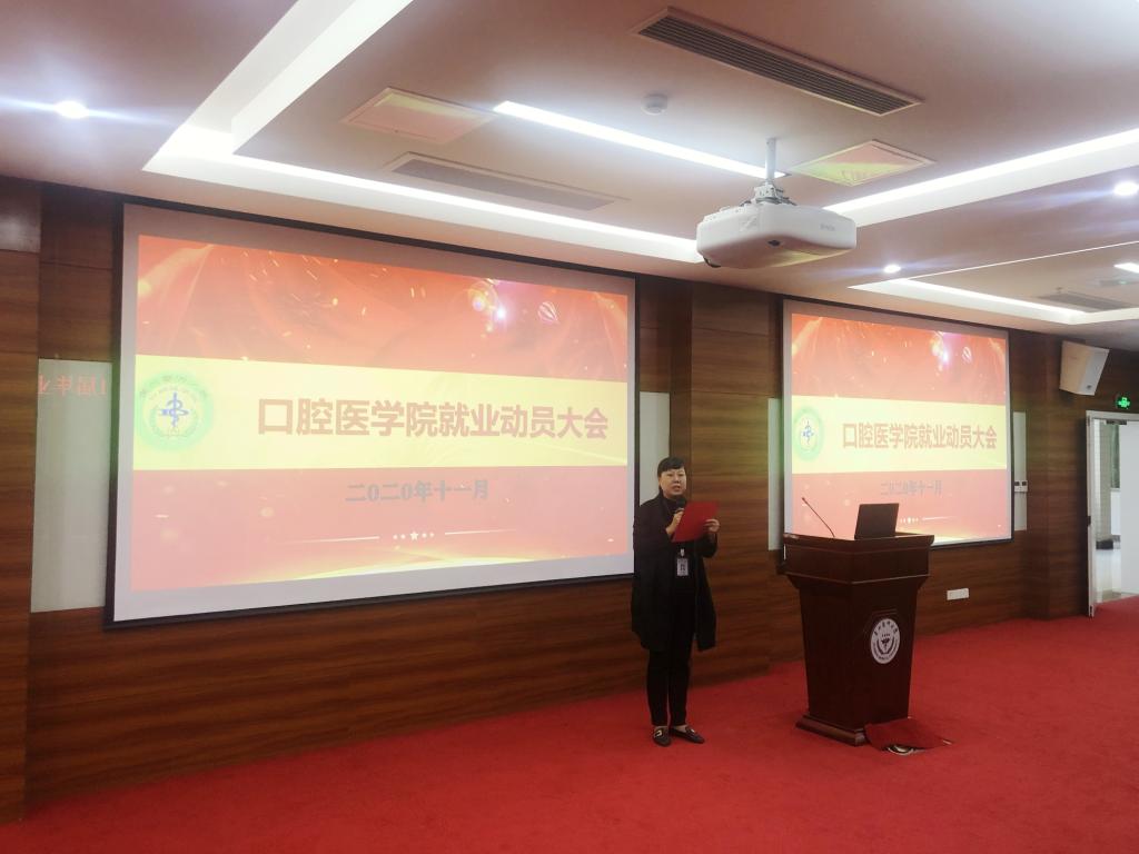 为让毕业生明晰当前严峻的就业形势,把握好就业机会,11月19日,口腔医学院2021届毕业班就业动员大会以“梦在心中,路在脚下”为题,在北校区临床技能中心207室召开。学校招生就业处副处长李季,口腔医学院党委书记张军梅,党委副书记、院长马洪出席本次会议,会议由学生管理科负责人张婷主持。