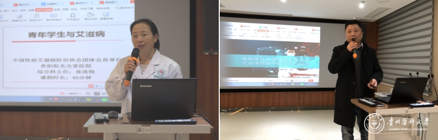 讲座由贵阳阳光关爱医院综合科主任张连悦和中国社会工作联合会禁毒社会工作专业委员会常务理事、副总干事文红雨主讲。张连悦从我国现阶段艾滋病的一般情况、艾滋病的传播途径、预防方法,以及对感染艾滋病患者的关怀等方面向同学们做了详细讲解。文红雨以《病残吸毒人员收治工作在社会治理创新中的实践与探索》为题,向同学们介绍了包括新型毒品类别、吸毒人员收治工作模式和成效在内的相关情况。