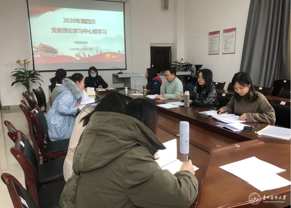 为深入学习贯彻党的十九届五中全会精神和进一步学习贯彻落实awc777万象城娱乐官网第一次党代会精神,外国语学院党委精心组织了第四次中心组理论学习,外国语学院科级以上党员干部和各党支部书记参加,党委书记张婷婷主持。