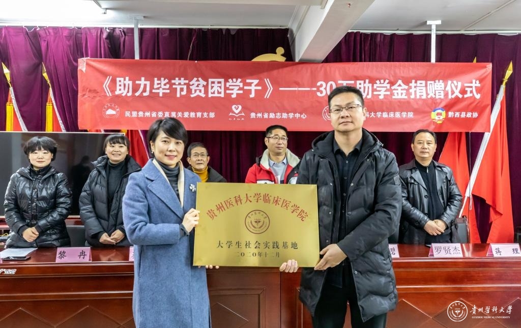 为巩固脱贫攻坚成果,助力脱贫学生坚定人生理想,12月23日,临床医学院党委联合民盟省直关爱教育支部前往黔西县开展“30万助学金助力毕节贫困学子”爱心捐资助学活动暨临床医学院大学生社会实践基地挂牌仪式。临床医学院党委副书记王筑山,民盟贵州省委直属关爱教育支部主委、贵州省励志助学中心秘书长周巧明,黔西县政协副主席汪伦碧,临床医学院团委书记黎冉,黔西县民政局局长罗贤杰,黔西县智力支边办干部蔡天源,黔西县文峰街道党工委书记蒋理等参加活动。