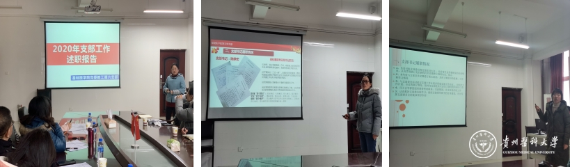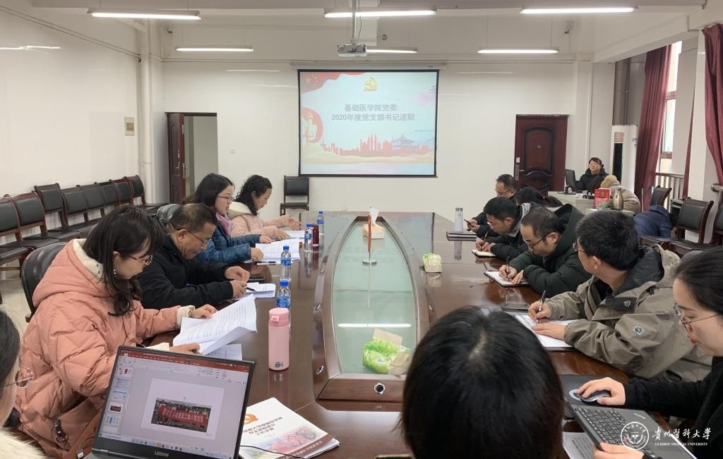 1月5日中午,基础医学院在务本楼二楼会议室召开2020年度党支部书记述职汇报会,基础医学院院长禹文峰、党委副书记王妤煜、副院长舒丽萍、副处级组织员邓欣、党委委员陈峥宏,各职能科室负责人参加并担任评委,教工、学生、研究生党支部书记参加述职。会议由王妤煜主持。