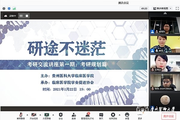 1月22日,临床医学院学业促进协会依托腾讯会议平台开展第一期“研途不迷茫”考研规划指导及经验分享会。临床医学院党委副书记王筑山、内科学教研室教师杨海军、2020级肿瘤学研究生张浩、2016级本科生刘谍作分享交流,会议由临床医学院团委书记黎冉主持。