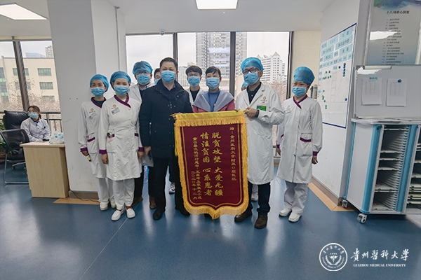 1月25日,在附属口腔医院病愈出院的王大爷委托驻村脱贫干部巩晓(省地方金融监管局一级调研员、紫云县火花镇洗鸭河村第一书记)送来锦旗,感谢医院的优质诊疗、费用减免和医护人员的精心照顾,表达其对附属口腔医院党委及全体医务人员的感谢。