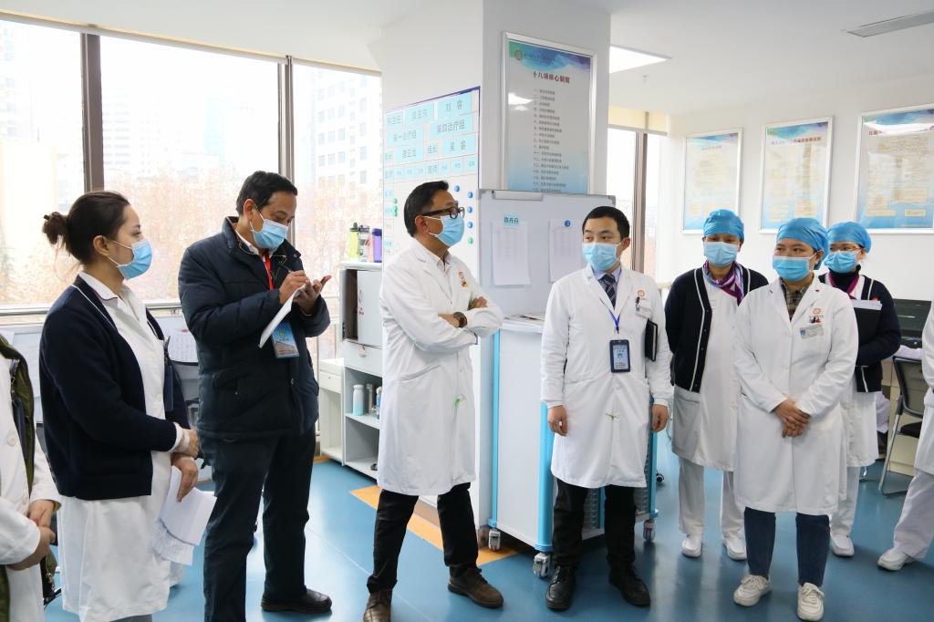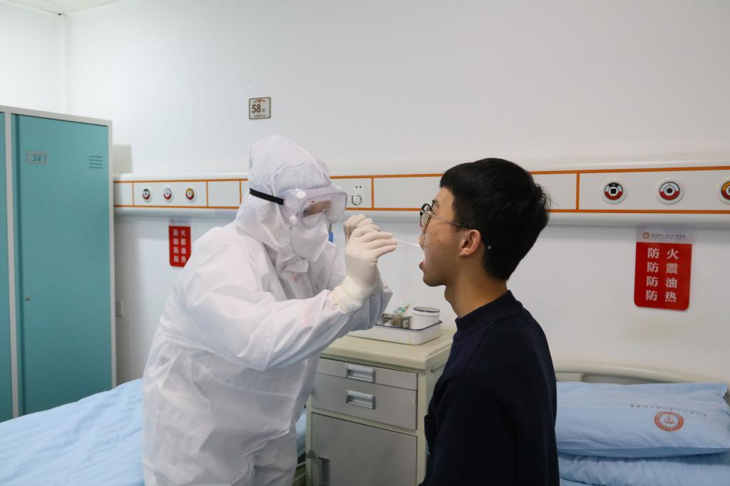 演练第一个项目是“口腔颌面外科病房患者发热处置流程”。口腔颌面外科值班护士使用体温枪监测患者体温时发现患者体温37.7℃ ,再次询问病史后发现患者有隐瞒流行病学史情况,6天前患者曾到过有病例报告社区的旅居史。(患者入院核酸检测阴性)。值班护士立即在该病房内按呼叫铃报告护士长并就地隔离,随后科室应急组织成员在科主任吴亚东的领导下,科室医疗救治组成员、疫情监测及流调报告组成员、后勤保障成员、消毒隔离成员等各组成员紧密配合,完成该患者的转床、按规划好的路线行CT检查、病房内核酸采样等具体事项。