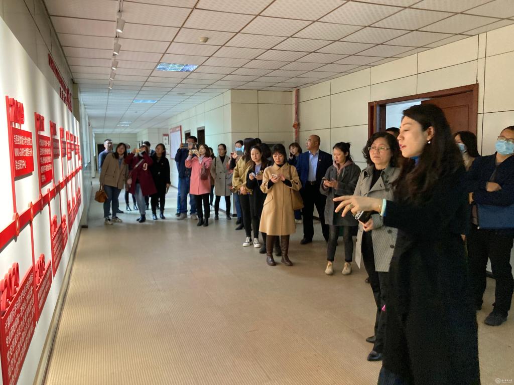 信息学院党委书记卿春等带领参观了信息学院党建文化走廊、智慧党建系统展示、电商扶贫直播室、示范党支部建设等。