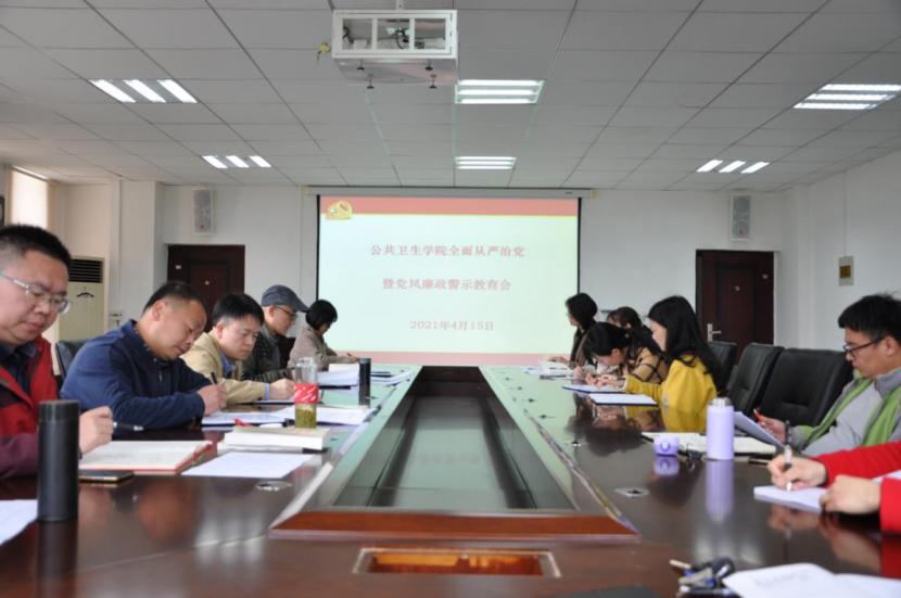 4月15日,公共卫生学院在南校区博雅楼二楼会议室召开2021年全面从严治党暨党风廉政警示教育会。公共卫生学院党政班子、各党支部书记、各科室和学系(中心)负责人参加。会议由院党委副书记何江主持。