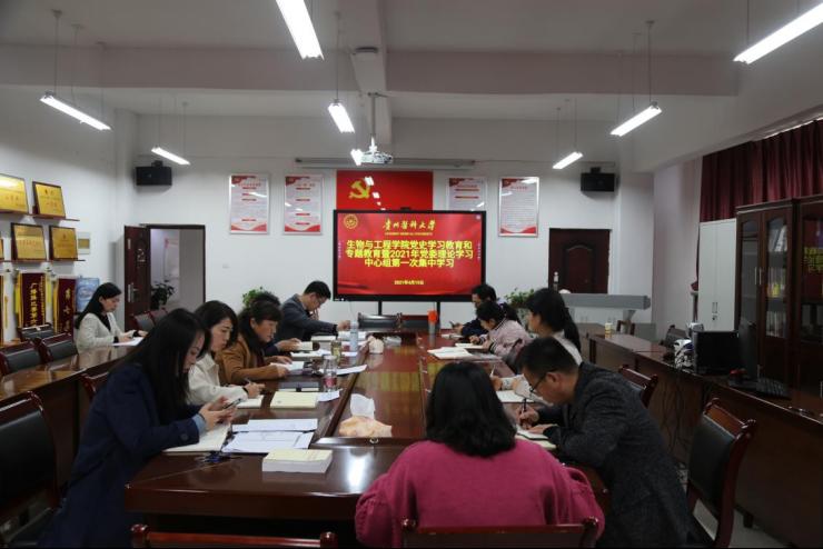 4月19日,生物与工程学院在厚德楼5楼会议室召开党史学习教育和专题教育暨2021年党委理论学习中心组第一次专题学习,党委领导班子成员、各科室负责人、各党支部书记参加,会议由院党委书记封韬主持。