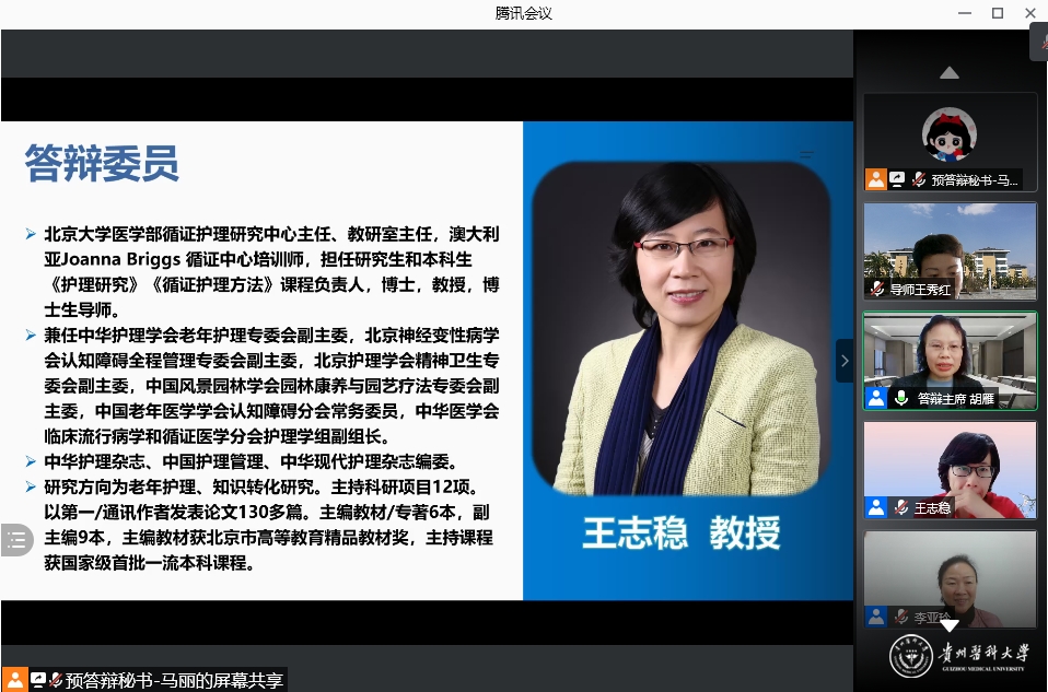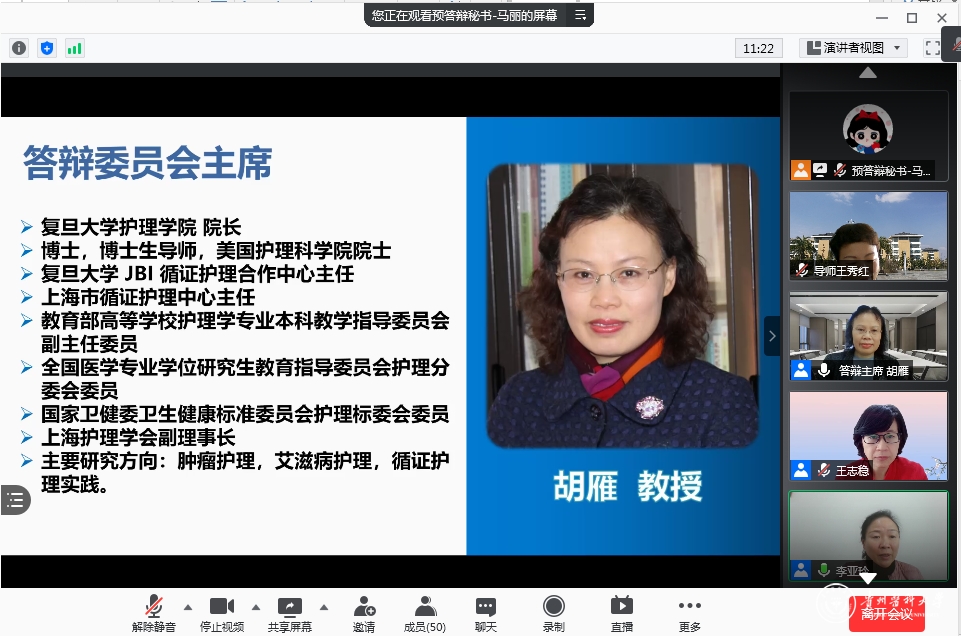 4月20日,护理学院2021届硕士研究生学位论文预答辩通过腾讯会议在线进行。此次预答辩邀请复旦大学护理学院院长、博士生导师胡雁教授任答辩委员会主席,北京大学护理学院博士生导师王志稳教授、awc777万象城娱乐官网附属医院陈腾祥教授、awc777万象城娱乐官网附属医院老年医学科莫显刚主任医师以及awc777万象城娱乐官网公共卫生学院汪俊华副教授担任答辩委员。护理学院导师、副导师、专业教师、研究生等参加,研究生院督导专家全程参与。