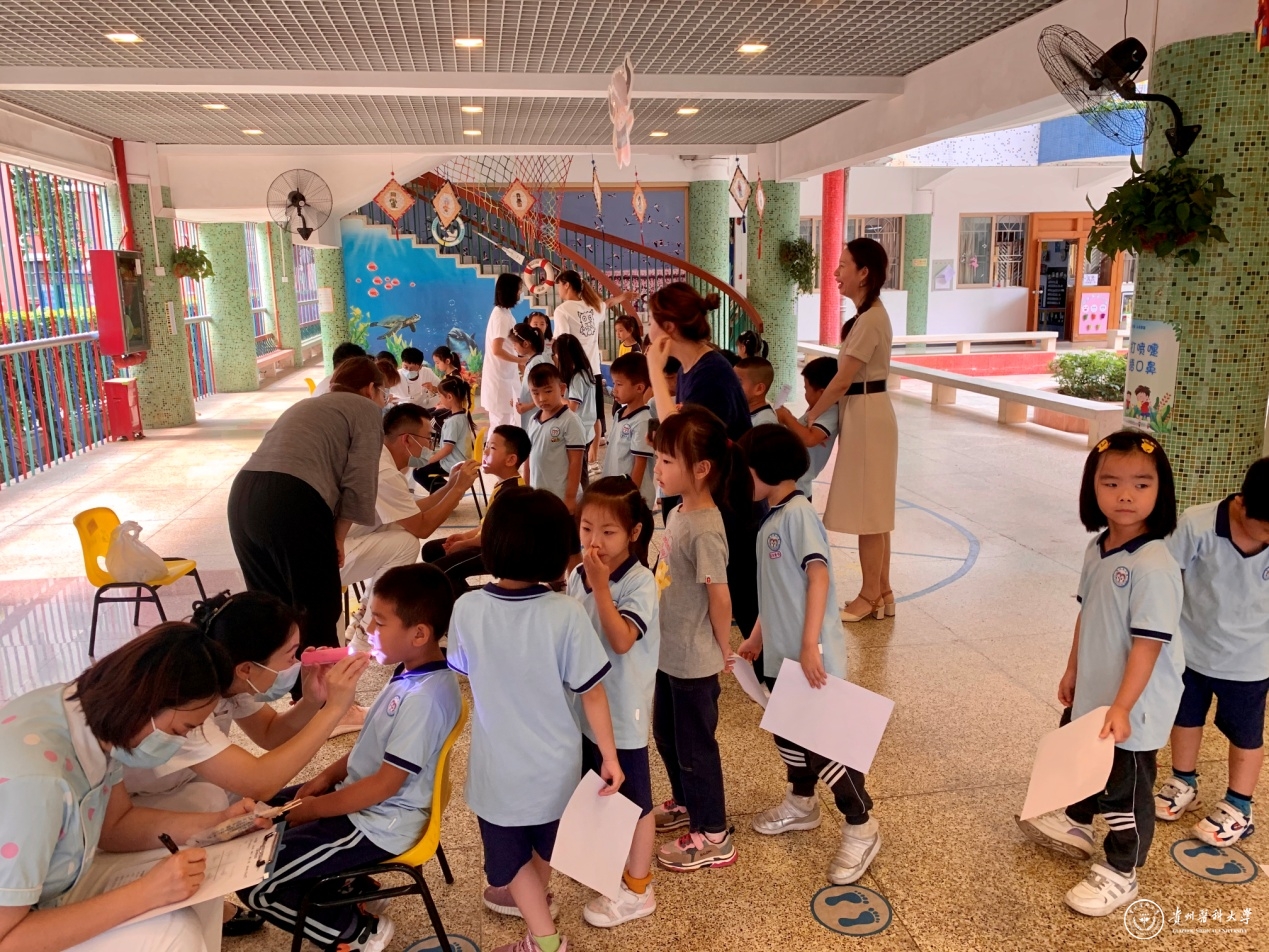 针对该年龄段儿童多发的龋齿问题、乳恒牙更替等,本次宣教活动主要从乳牙龋、儿童涂氟、窝沟封闭、儿童牙病预防、刷牙等方面进行展开,考虑到不同年龄的儿童对于知识的接受程度和理解能力,根据不同年龄的儿童口腔的特点,各有侧重点的进行讲解。针对幼儿园小朋友对于新鲜事物的好奇性和探索性的问题,此次宣教更多的是采取问答、互动等方式进行展开,如正确有效刷牙方法的演示,刷牙儿歌的学习等,增加了趣味性的同时,也让小朋友们更好的掌握了有关口腔健康的知识,有助于小朋友们养成良好的口腔卫生习惯。此外,还通过一对一口腔检查互动的方式宣传口腔健康知识。100余名小朋友排着整齐的队伍有序地进行全面的口腔检查,医护人员认真登记填写检查表并给出口腔诊疗建议。