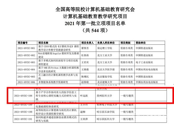 近日,经过全国高等院校计算机基础教育研究会评审,“全国高等院校计算机基础教育研究会计算机基础教育教学研究项目”2021年第一批通过立项项目共544项,大健康学院副院长叶远浓博士申报的《基于产学合作协同育人的医学信息工程专业核心课程实施方式的研究与实践》获得立项,项目编号为:2021-AFCEC-188,是大健康学院教学改革研究中的又一突破。