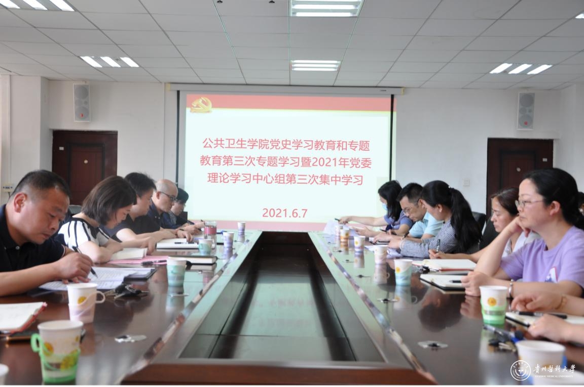 6月7日,公共卫生学院在博雅楼二楼会议室开展党史学习教育和专题教育第三次专题学习暨2021年党委理论学习中心组第三次集中学习。会议由院党委书记郑维薇主持。院长洪峰、党委副书记何江,副院长李军、张清海,毒性检测中心副主任涂成龙、环境与健康重点实验室副主任王大朋,各党支部书记和支委委员、各科室和学系(中心)负责人参加。