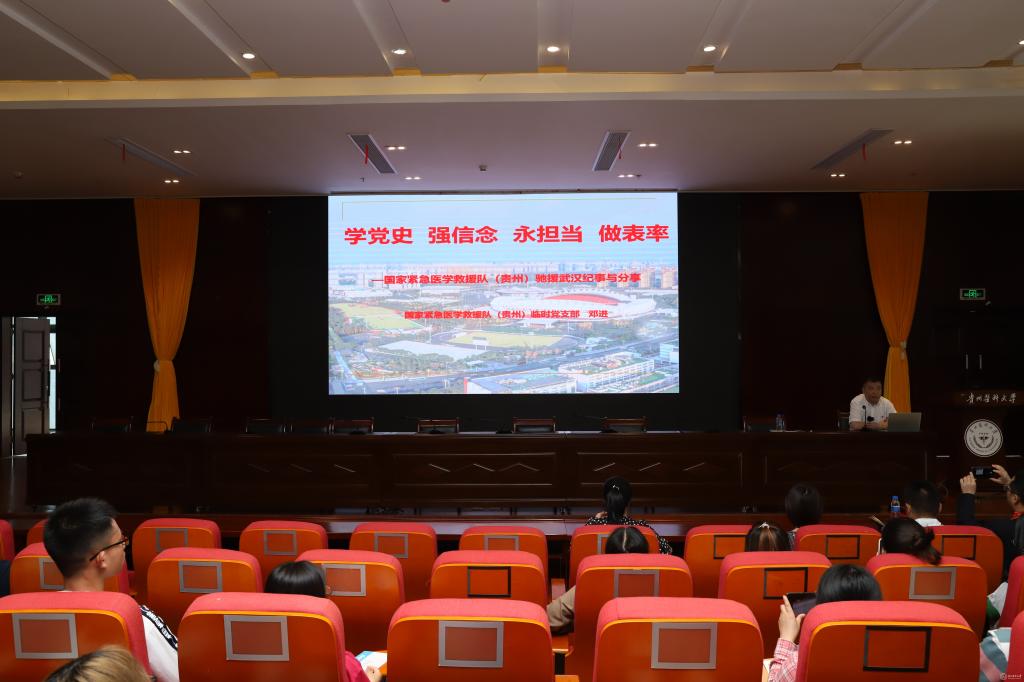 为推进万象城官网党史学习教育和“牢记殷切嘱托、忠诚干净担当、喜迎建党百年”专题教育走深走实,6月8日,学校党委邀请了贵州省第三批援鄂医疗队队长、全国抗击新冠肺炎疫情先进集体——awc777万象城娱乐官网附属医院国家紧急医学救援队(贵州)临时党支部书记、awc777万象城娱乐官网附属医院医务处副处长、急诊第三支部党支部书记邓进和贵州省三穗县款场乡龙脚村第一书记、驻村工作组组长、全省脱贫攻坚优秀共产党员、全国脱贫攻坚先进个人获得者、awc777万象城娱乐官网党委学生工作部(学生处、武装部)副部长(副处长)陈秋讲党课。全校各部门师生党员代表、第54期入党积极分子培训班及第10期发展对象培训班部分学员参加。