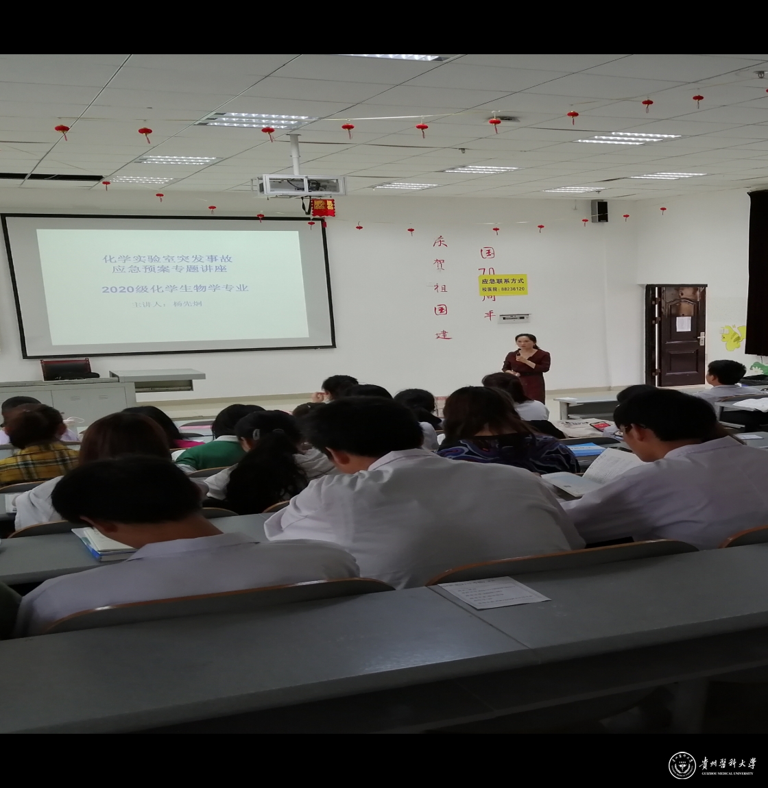 支部书记杨先炯利用休息时间,给2020级化学生物学专业同学作“化学实验室突发事故的应急预案”专题讲座,着重介绍一般的应急处理方法,灼伤、玻璃等造成的外伤、预防火灾、触电等应急处理预案,并做实地演习,让同学们明白如何开展安全自救,避免盲目自救引起次生人身伤害。