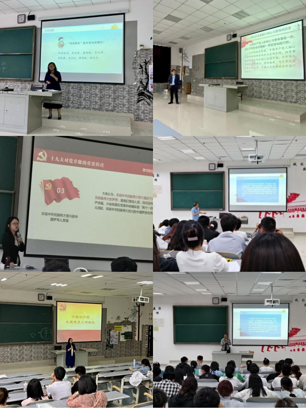 学院党委书记王妤煜、院长禹文峰、党委副书记张贤、副院长舒莉萍、副处级组织员刘亮,分别从《中国共产党章程》的解读、深入学习党章党规党纪、党员发展的程序、习近平新时代中国特色社会主义思想四方面为入党积极分子培训班的学员进行授课。