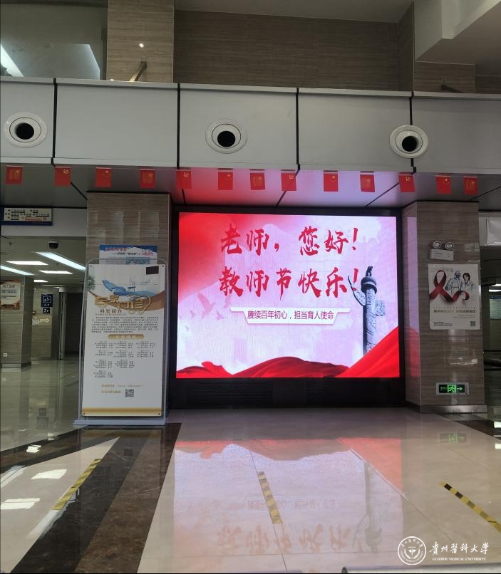 口腔学院为积极响应教育部2021年为教师亮灯公益活动要求,将主题词为“老师您好!”“教师节快乐!”“赓续百年初心,担当育人使命!”的祝福语在口腔医院大厅显示屏上进行宣传,引导师生感念师恩,礼敬教师,营造浓厚的节日氛围。
