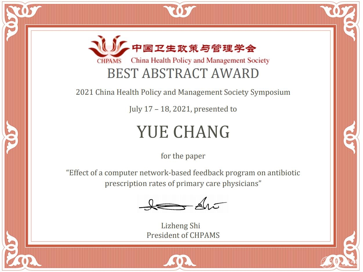 医药卫生管理学院常悦教授参加此次会议,并围绕主题“基于计算机网络反馈程序对基层医生抗生素处方率的影响”进行了英文汇报,与会国内外专家学者对汇报表示有浓厚兴趣,并就相关问题进行了深入的交流与讨论。最终和浙江大学、复旦大学、佐治亚大学、罗彻斯特大学一同斩获最佳文摘奖。