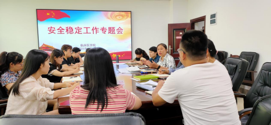 周红对学院安全稳定工作作安排部署,要求临床医学院全体员工,要提升政治站位,筑牢安全意识,充分认识维护高校安全稳定对维护全局稳定的重要作用,把思想行动统一到中央、省委、校党委决策部署上来。要强化责任落实,排查安全隐患,坚持“党政同责、一岗双责、齐抓共管、失职追责”的要求,压紧压实责任,常态化履行好安全工作主体责任。要开展全方位、立体式安全排查。要做好应急处置,紧盯重要节点。健全完善应急预案,提高防范和应急处置能力。