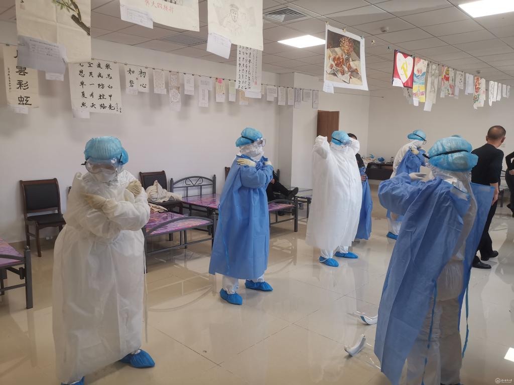 张余、谯瑞等一线防疫人员在实习带教老师耐心讲解下,认真学习防护服穿脱。