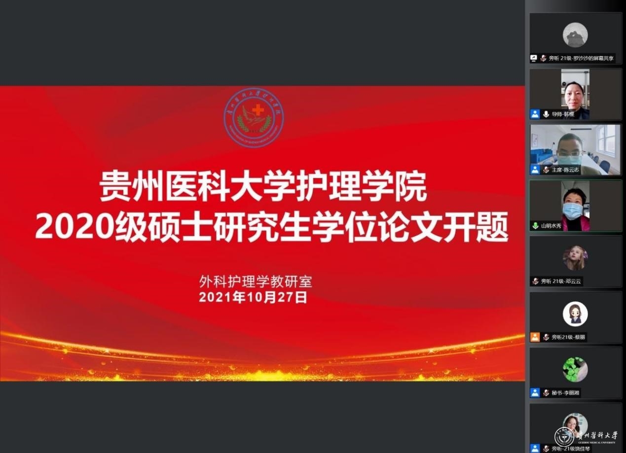 10月26日、27日、29日护理学院2020级硕士研究生开题通过腾讯会议在线进行。此次开题分别邀请中南大学湘雅护理学院郭佳教授、刘民辉副教授及贵州中医药大学陈云志教授任开题委员会主席;北京大学护理学院王志稳教授、 中南大学湘雅三医院健康管理中心秦春香教授、中南大学湘雅护理学院杨敏教授、孙枚副教授和王瑶副教授及《护士进修杂志》主编张秀主任、中山大学中山眼科中心肖惠明主任护师、华北理工大学护理与康复学院陈长香教授、广州市护理学会会长黄雪仪主任护师、贵州中医药大学护理学院石国凤教授、awc777万象城娱乐官网公共卫生学院流行病学与卫生统计学王子云副教授和汪俊华副教授等担任开题专家委员。护理学院导师、副导师、专业教师、研究生等共计参会150人次,研究生院督导专家全程参与。