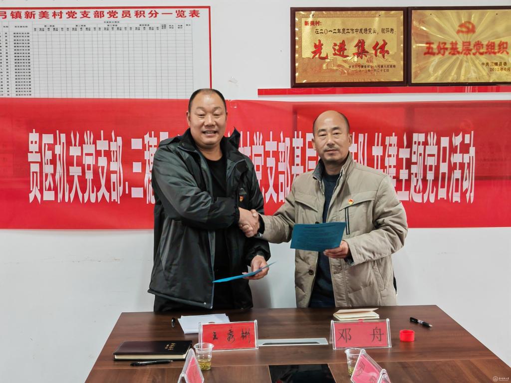 为充分发挥党组织和广大党员推动发展、凝聚人心、促进和谐的作用,努力构建“资源共享、优势互补、互相促进、共同提高”的党建工作新格局,机关党支部与八弓镇新美村党支部就巩固脱贫攻坚成果、创新推动村集体经济、党支部标准化规范化建设等进行了深入交流,在统一工作思路、达成思想共识的基础上,机关党支部书记邓舟与新美村支部书记王秀彬签署了基层党建结对共建协议。