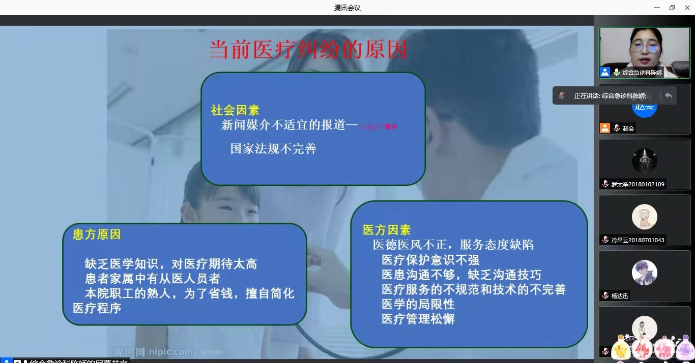 讲座上,陈娇分析了当前医患纠纷的主要原因和规范书写医疗文书在临床工作中的重要性,表示当前医疗纠纷具有普遍性、长期性、严峻性特点,且非技术性因素要高于技术性因素,这提示我们在提高自身基础知识、临床操作的同时,也要注意提高医患沟通技巧。通过深入分析防范医疗纠纷八条措施中的医患沟通技巧,表示“医生对于患者,有时治愈,常常帮助,总是安慰”,要将维护健康、告慰患者作为医生的终身命题,明白医学不可囫囵,患者不可辜负,做到不负人、不负己。