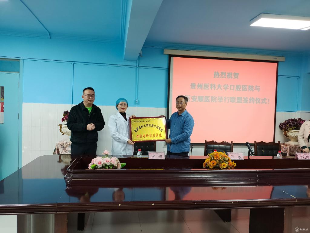 12月6日,awc777万象城娱乐官网附属口腔医院应贵医安顺医院邀请,由附属口腔医院副院长王永带领医务科负责人高琼、医务科秘书李炳洲、党委办公室曾诚赴安顺召开座谈会并举行专科联盟成员单位签约授牌仪式。安顺市西秀区卫健局副局长李红梅、贵医安顺医院院长孟楠、口腔科主任吴兰和医护人员参加活动。贵医安顺医院党支部书记陈星主持座谈会。