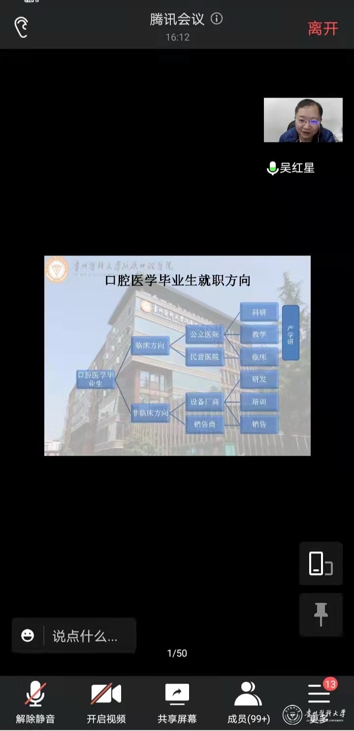 12月8日、10日,附属口腔医院毕教科吴秋蓉,贵阳市口腔医院规培生、口腔医学院毕业生李长菁分别以“关于规培那些事儿”“毕业•规培”为主题,给我院2019级、2017级学生开展主题讲座。帮助同学们系统了解住院医师规范化培训,让同学们直观、全面了解住院医师规范化培训招考的最新动态,为同学们今后准备规培指明方向。