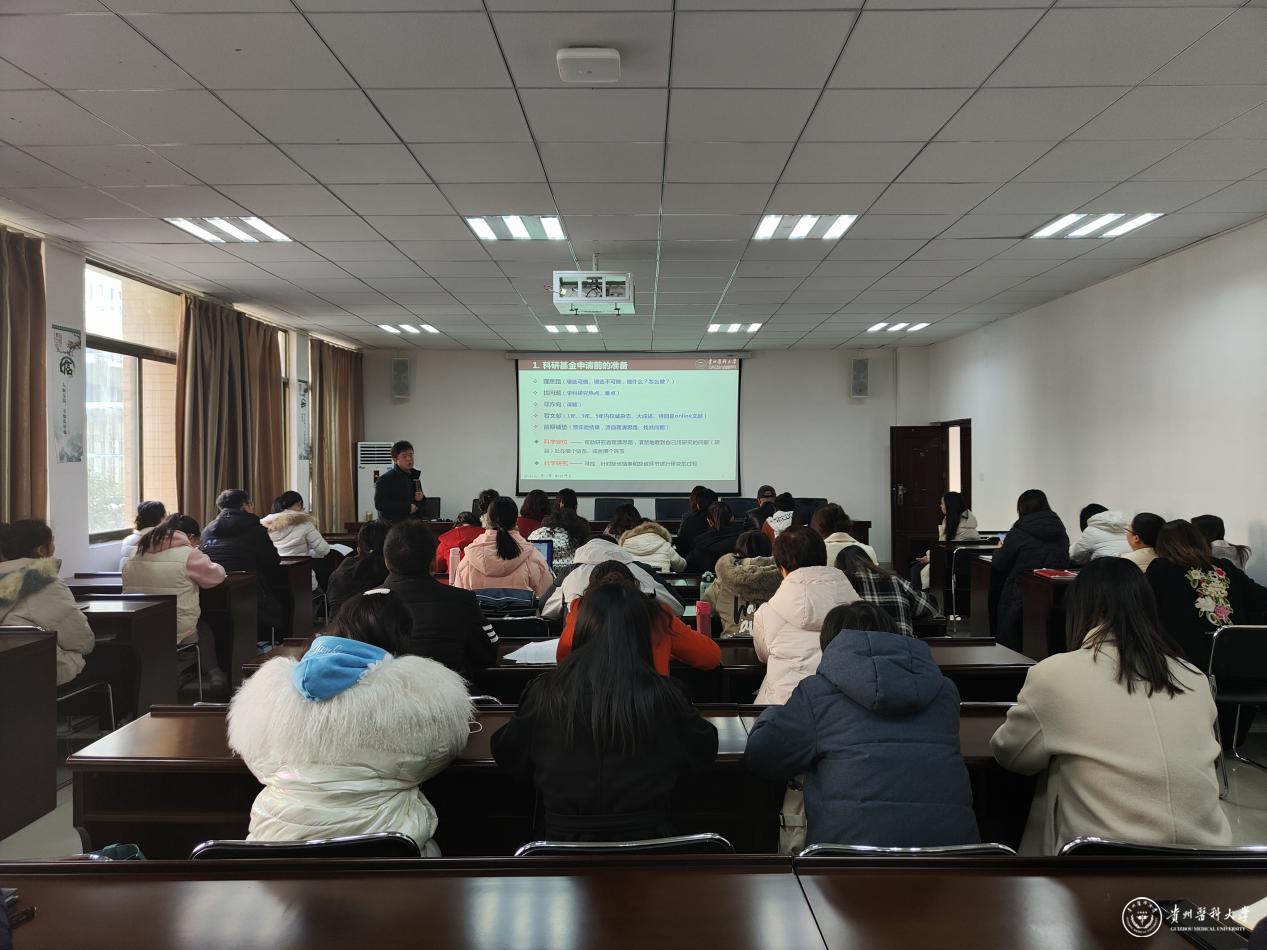 洪峰以《如何写好一份科研项目申请书》为题,结合自身国家自然科学基金项目的申报经验,就申请书撰写的要点、策略进行了详细讲解,并与参会教师进行了互动交流,答疑解惑。