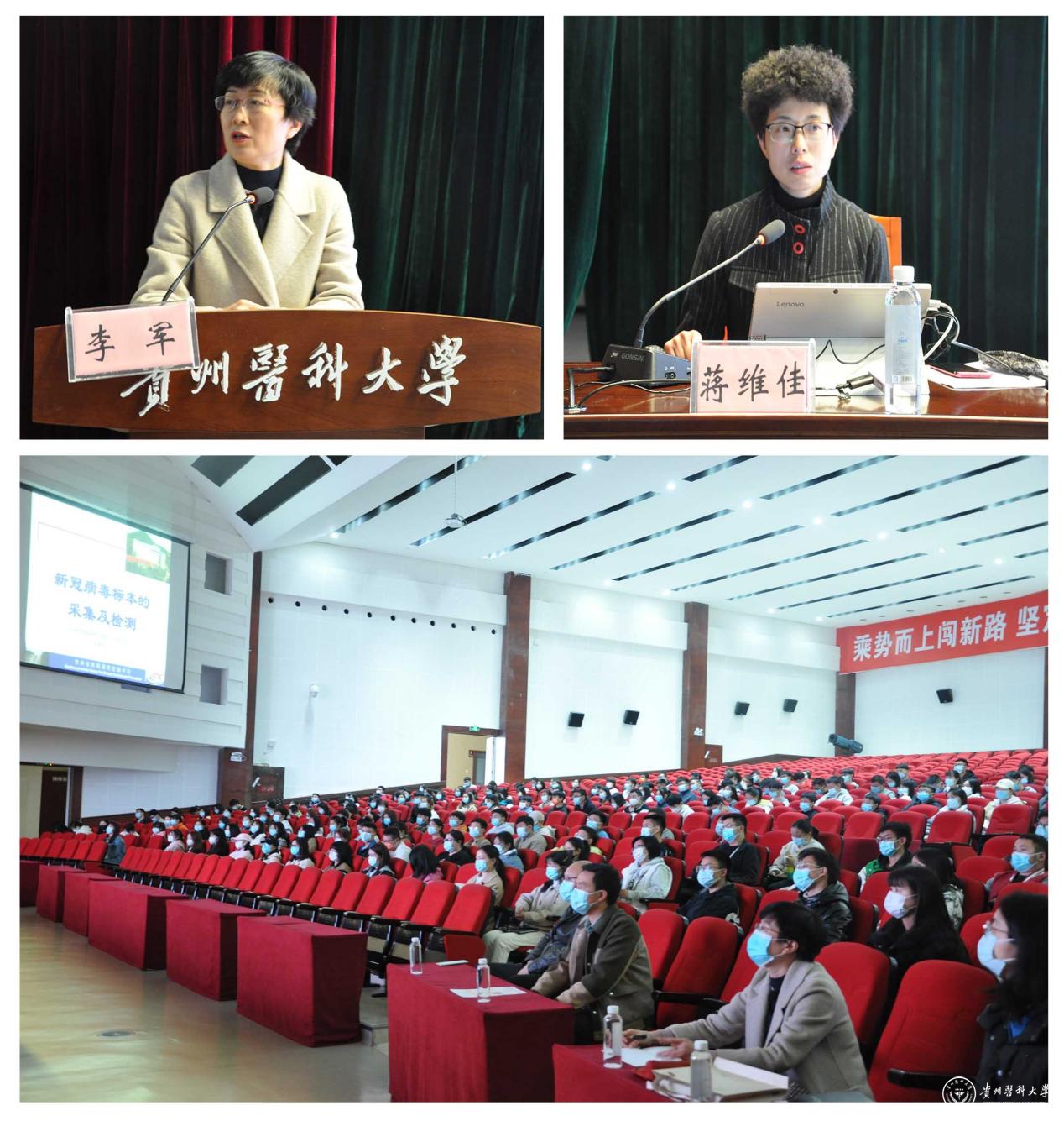 为更好的发挥公共卫生教学实习基地“联合教学”人才培养特色,充分发挥贵州省疾病预防控制中心(CDC)师资与资源优势,促进公共卫生与健康学院师资队伍能力建设及实用性创新型公共卫生人才的培养;提升学院应届毕业生专业应用理论与实操技能,提升就业竞争力,学院邀请了贵州省CDC病毒科专家蒋维佳主任医师为学院2017级预防医学专业、2018级卫生检验与检疫、2018级食品卫生与营养学专业应届本科毕业生开展有关新冠病毒核酸采样、核酸检测、结果分析判定等相关知识的培训,公共卫生与健康学院、环境污染与疾病监控教育部重点实验室教师与研究生参加培训。