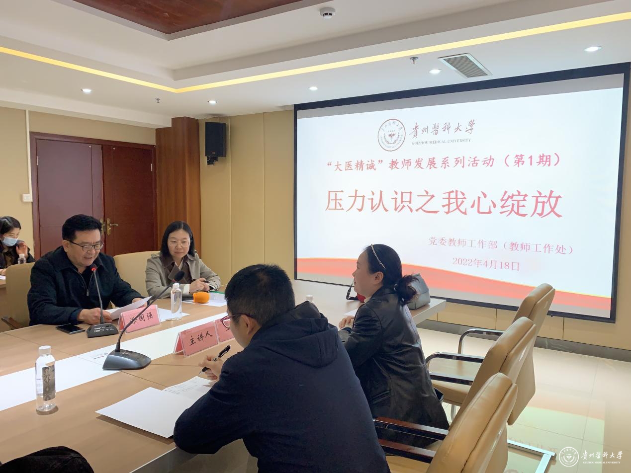 4月18日,学校“大医精诚”教师发展系列活动拉开序幕,首场研讨会以“压力认识之我心绽放”为主题,在南校区博安众创空间路演厅举行。党委教师工作部(教师工作处)徐国强部长(处长)主持,全校各学院教师代表参会。