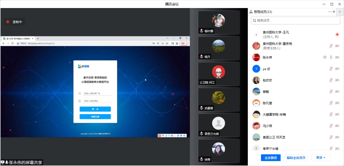 北京心领育科技有限公司技术负责人张永伟工程师通过腾讯会议系统培训了平台的操作流程,并就如何利用大数据平台建立学校四级防控机制、开展心理危机学生评估、上报与干预等方面进行了详细的讲解。