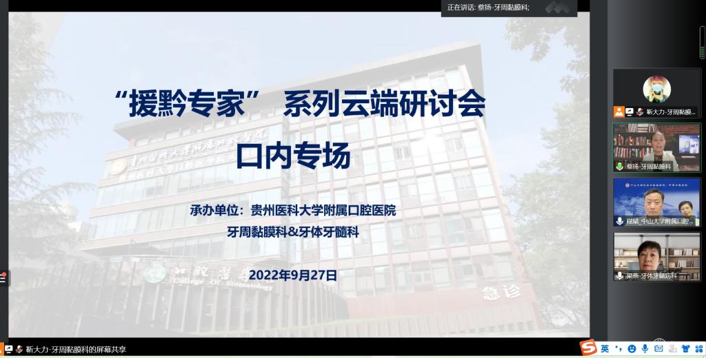 9月27日,口腔医院教工第六党支部所在科室牙周黏膜科、教工第十党支部所在科室牙体牙髓科联合开展援黔专家系列口内专场云端研讨会,通过视频会议为疫情期间的“集中”学习创造条件。