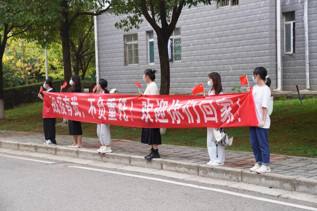 10月5日,基础医学院支援观山湖区气膜方舱实验室的100名师生,在经过18天奋战后,圆满完成任务,胜利凯旋。校党委副书记汤磊、副校长沈祥春、相关部门负责人以及基础医学院党政领导、全体辅导员,在南校区学生宿舍六栋路口欢迎青年突击队回家。