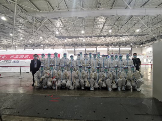 9月17日中午,基础医学院接到通知,闻令而动,迅速组建7名教师、93名学生志愿者,并于当天下午从花溪大学城出发支援观山湖区气膜方舱实验室。志愿者到达观山湖会展中心方舱实验室驻地后,快速组建小分队,进行院感专家集中院感学习、防护服穿脱等培训,持续到凌晨3时。100位队员,分为两个小队,分别由肖朝伦、王琪老师带队进驻“御兔号”,石明隽、韩冰老师带队进驻“火眼号”方舱实验室;另崔古贞、田益明两位老师全程参与整个会展方舱实验室院感,刘旭老师协助会展方舱领导小组日常事务工作,肖朝伦老师负责全体志愿者的日常事务及与方舱领导指挥部领导的协调对接。从那一刻起,青年突击队的抗疫行动开始了,每天依据分工各自忙碌而充实。